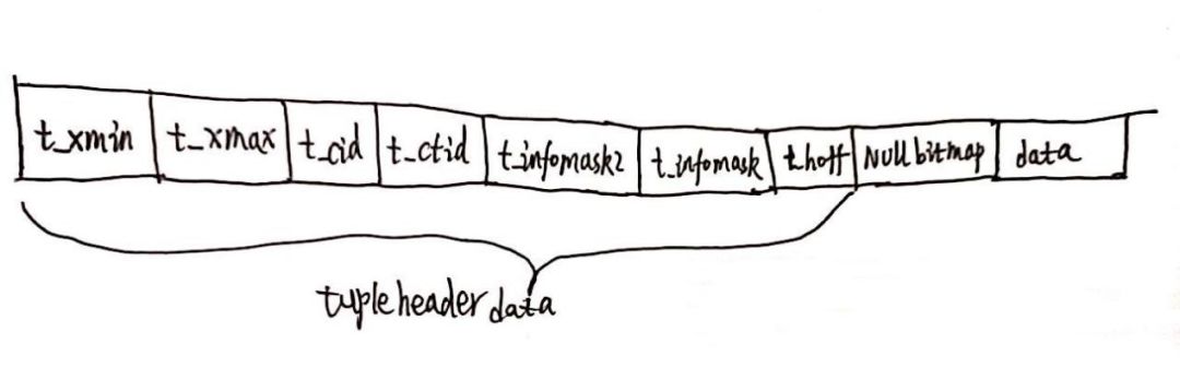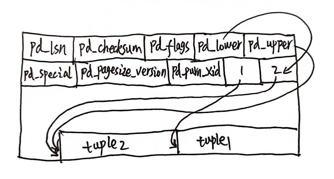 从上面的结构我们可以看到,pd_lower和pd_upper分别指向空闲空间的起始和终止位置,而图中的1和2是行指针,分别指向真实的元组位置。