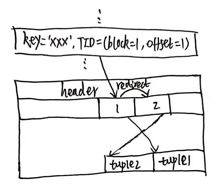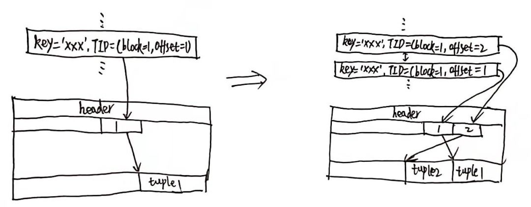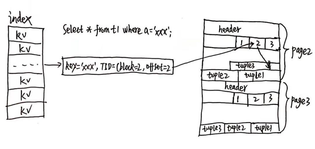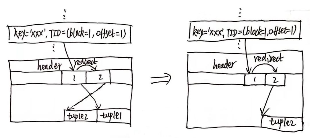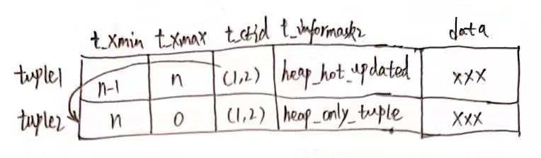 我们知道索引元组中是kv的结构,key代表的是查询条件的值,value即TID,TID中记录了两部分信息,block=2代表页面号,数据位于第几个块(页面),offset=2代表第二个元组,这样就通过索引直接定位了某一条记录,而不需要对页面进行扫描。下面我们进入正题,我们再来看看元组是如何更新的,我们知道元组的更新其实是新插入一条记录如下图所示,如果没有hot技术的话,每更新一个行,就会插入一个元组,同时会在索引页中新增一一条元组,该元组中的tid指向新的元组,而索引的维护开销也是非常大的,可以想象,这样的话在频繁更新的系统中不仅数据会膨胀而且索引也会膨胀,同时维护索引的开销太大。于是postgresql使用HOT(堆内元组技术)解决这个问题,总体思想是在更新时通过修改指针指向定位新元组,而不需要插入相应的索引元组。我们来看看hot更新的流程:在元组结构的t_informask2字段中有两个标记位,heap_hot_update和heap_only_tuple,在更新tuple1时,postgresql会将tuple1(老元组)的标记位置为heap_hot_update,同时将tuple2(新元组)的标记位置为heap_only_tuple。2.然后通过索引元组中的位置,访问行指针数组,找到行指针14.发现tuple1的标记位是heap_hot_update,于是通过tuple1的t_ctid字段读取tuple2(上面也提到过,当元组被更新过后,元组的t_ctid字段指向新的元组)上面的过程其实访问了tuple1和tuple2两个数据块,这时我们可能会考虑到一个问题,如果tuple1因为vacuum清理掉了,就无法通过tuple的ctid字段定位到tuple2了,为了解决这个问题,postgresql会在合适的时候进行行指针的重定向(redirect),这个过程称为修剪。2.然后通过索引元组中的位置,访问行指针数组,找到行指针1在postgresql进行修剪时,会挑选合适的时机来清理死元组,这个过程称为碎片整理,如下图所示:碎片整理并不会清理索引元组,所以碎片整理比普通vacuum清理的开销要小的多。HOT特性降低了表和索引的空间消耗,同时减少了vacuum需要处理的元组数量,对于性能有很好的提升。当然HOT技术也不是万能的,它也有不适用的场景,比如下面两个场景:1.当更新的元组和老元组不在同一个page中时,指向该元组的索引元组也会被添加到索引页面中。2.当索引的key值更新时,会在索引页面中插入一条新的索引元组。
