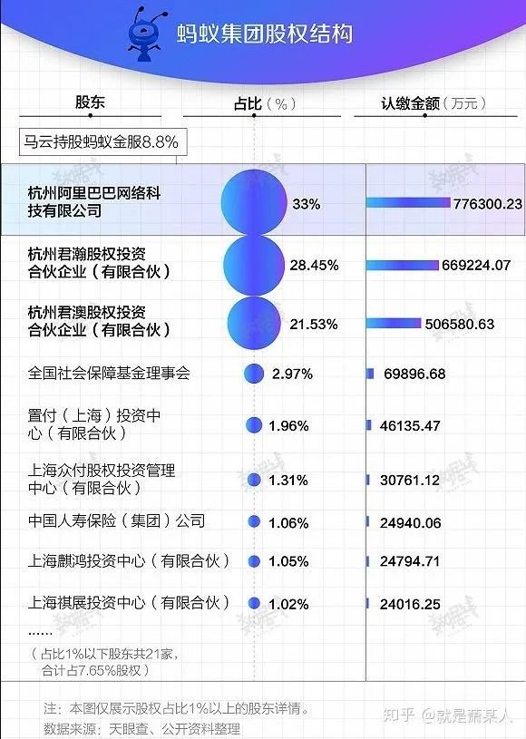 翻开蚂蚁集团的股东名单,阿里巴巴以 33% 的持股比例成为第一大股东,杭州君瀚股权投资合伙企业持股 28.45%、杭州君澳股权投资合伙企业持股 21.53%紧随其后。