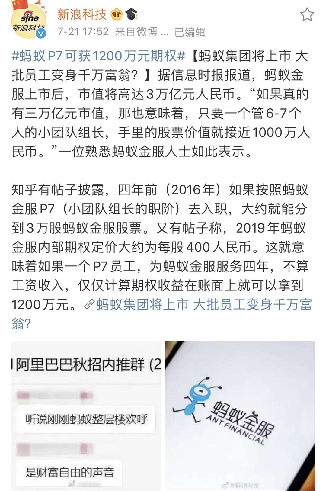 这就意味着如果一个 P7 员工,为蚂蚁金服服务四年,不算工资收入,仅仅计算期权收益在账面上就可以拿到 1200 万元。