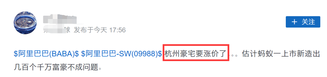 听说第一手消息已经传到了卖房中介的耳朵里,他们已经连夜印刷豪宅 DM 单,组团潜伏在蚂蚁金服总部楼下,见到保安都一脸春风的问“霞飞路传世独栋请了解一下,总价不过四千八百万。”