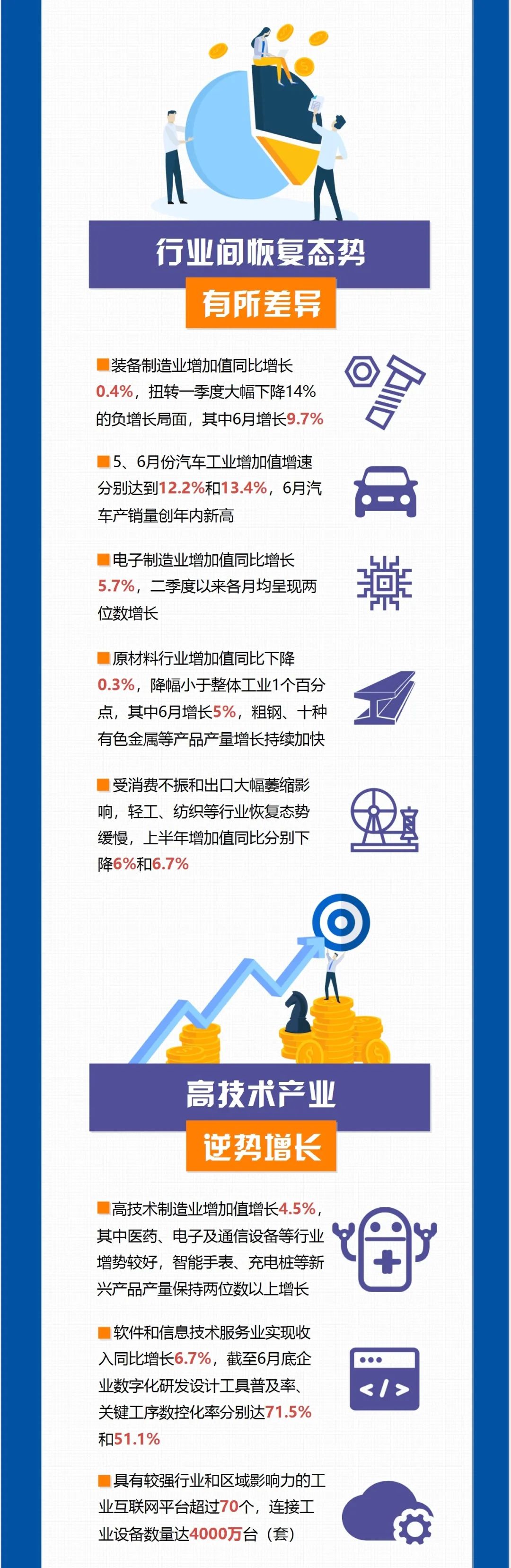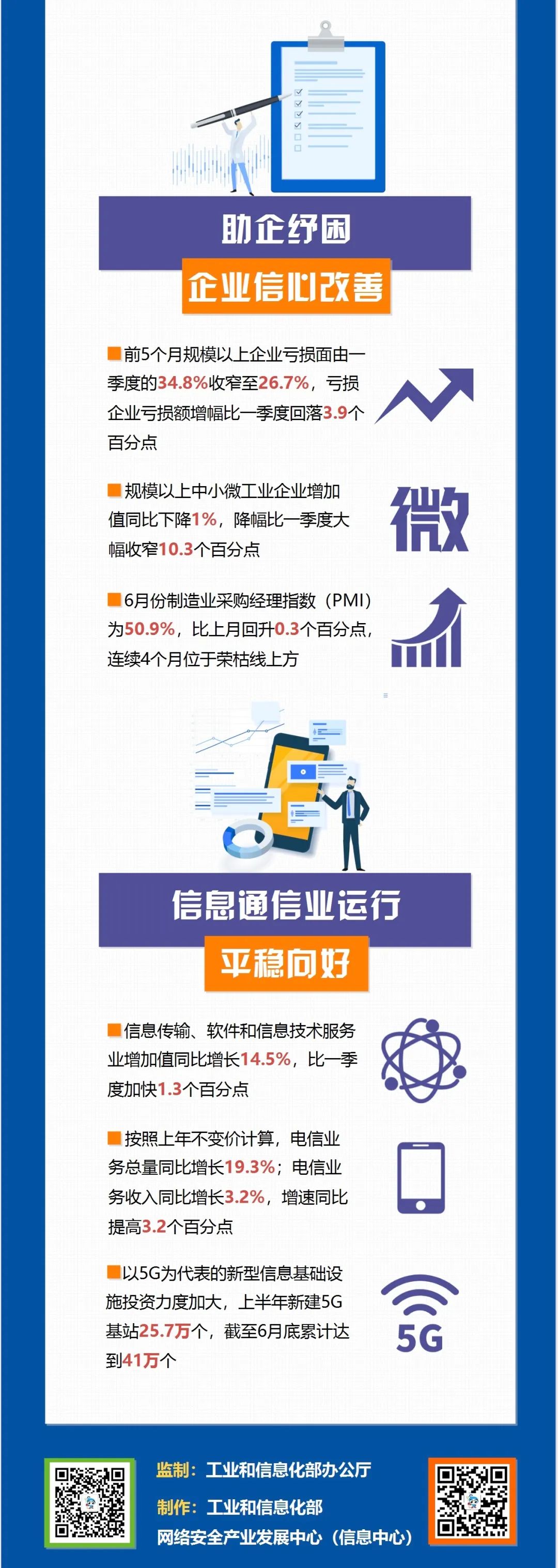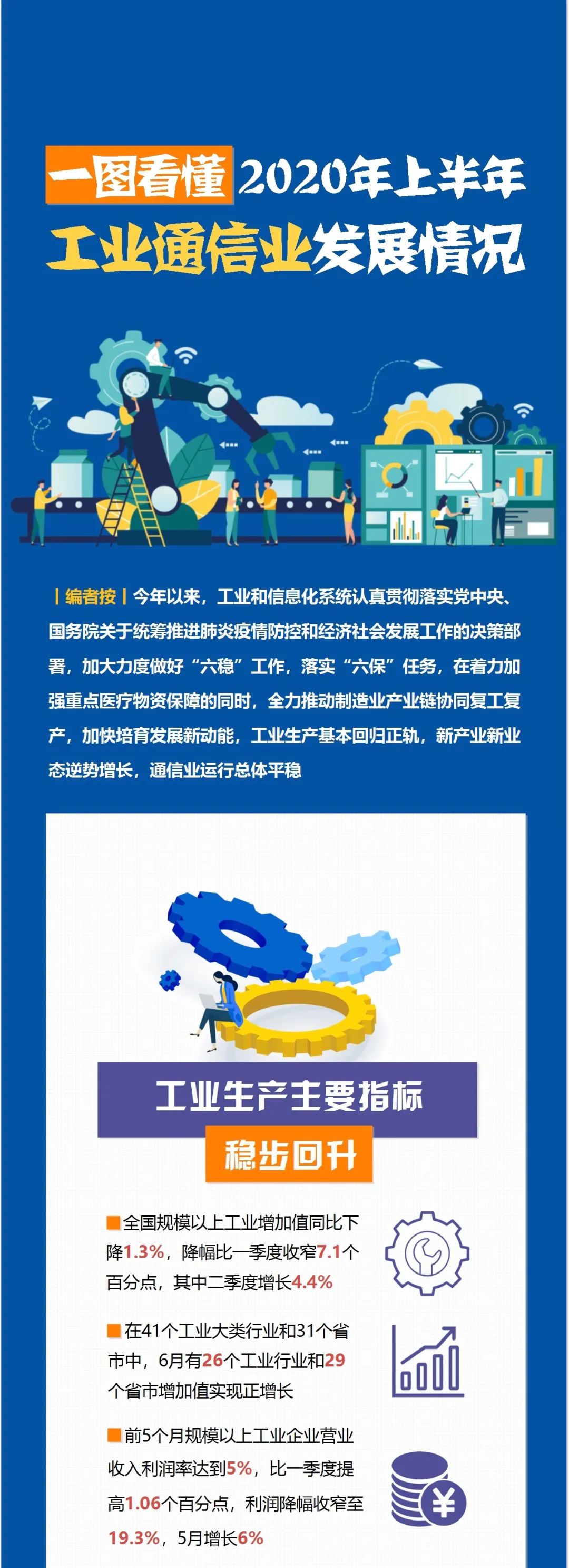 今年以来,工业和信息化系统认真贯彻落实党中央、国务院关于统筹推进肺炎疫情防控和经济社会发展工作的决策部署,加大力度做好“六稳”工作,落实“六保”任务,在着力加强重点医疗物资保障的同时,全力推动制造业产业链协同复工复产,加快培育发展新动能,工业生产基本回归正轨,新产业新业态逆势增长,通信业运行总体平稳。具体发展情况如何?一图读懂↓↓