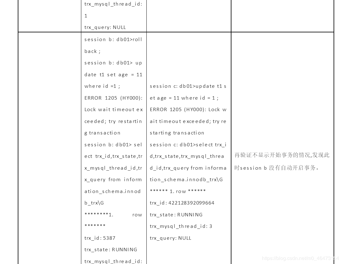 innodb_rollback_on_timeout=off的情况下,显示开启事务,造成锁等待超时时,会回滚造成超时的那条语句,但是事务不会结束.
