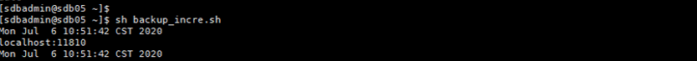 [sdbadmin@sdb05 ~]#cat backup_incre.sh#!/bin/bashdate/opt/sequoiasql/mysql/bin/mysqldump --login-path=mysql -A -d > sdbdata/backup/full/create`date +%y%m%d%H`.sql/opt/sequoidb/bin/sdblist -l -m list > sdbdata/backup/full/sdblist`date +%y%m%d%H`.sql/opt/sequoiadb/bin/sdb 'db=new Sdb();'/opt/sequoiadb/bin/sdb 'db.backup ( { Name : "cluster_backup", Path : "/sdbdata/backup/full/%g", EnsureInc : true } );'date