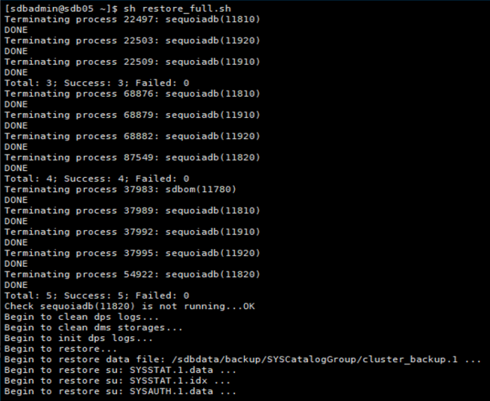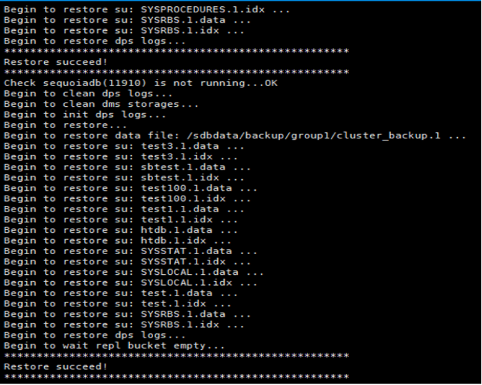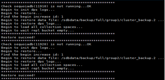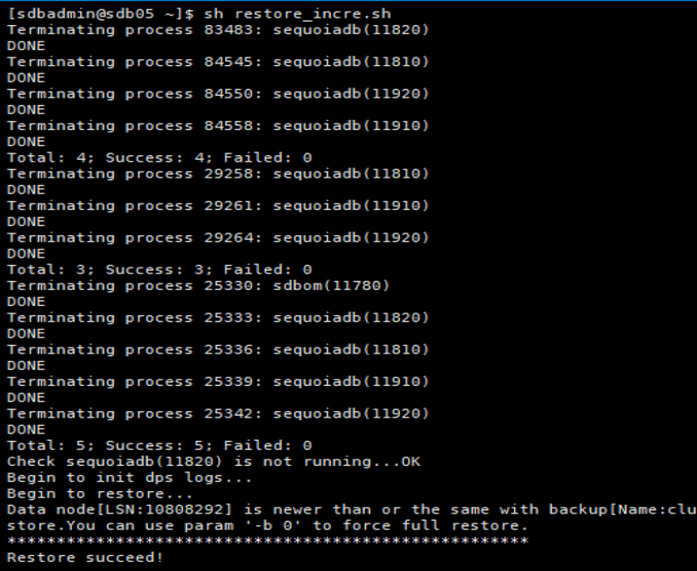 [sdbadmin@sdb05 ~]#cat restore_incre.sh#!/bin/bash#停止集群for hostname in {sdb03,sdb04,sdb05}dossh $hostname /opt/sequoiadb/bin/sdbstop -t alldone#增量恢复副本数据for groupname in `cat /sdbdata/backup/full/sdblist20200717.sql | awk '{print $8}' | grep -Evi "GroupName|SYSCoord"`do/opt/sequoiadb/bin/sdbrestore -p /sdbdata/backup/full/$groupname/ -n cluster_backup -b -1done#启动集群/bin/read -p " Do you want to start SequoiaDB(yes or no)? " Dowhile [[ "$Do" != "no" ]] && [[ "$Do" != "yes" ]]do/bin/read -p "Do you want to start SequoiaDB(yes/no)?" Dodoneif [ "$Do" == "yes" ]thenfor hostname in {sdb03,sdb04,sdb05}dossh $hostname /opt/sequoiadb/bin/sdbstart -t alldoneelif [ "$Do" == "no" ]thenecho "please start SequoiaDB by hand"fi