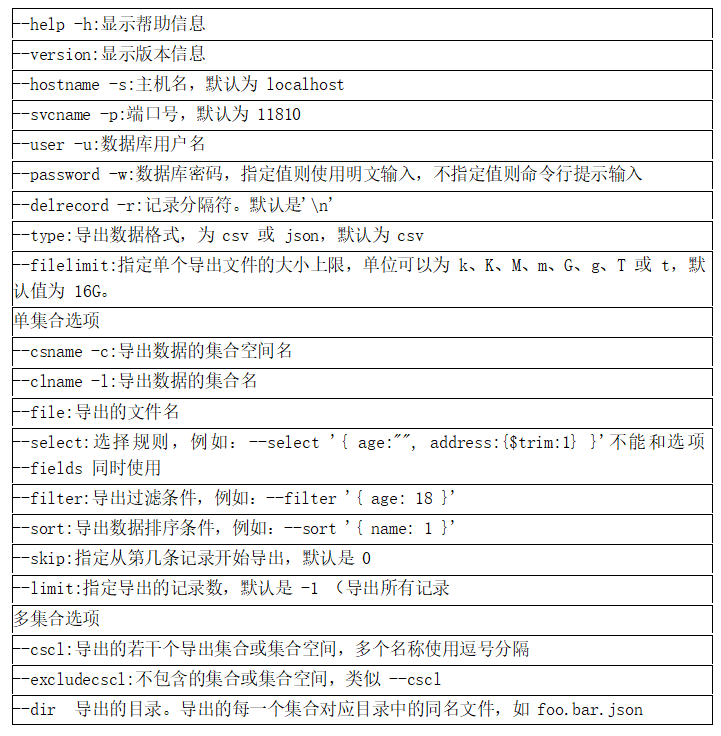 (1)导出集合sbtest.sbtest1 的数据sdbexprt \--hostname "localhost" \--svcname "11810" \--user "sdbadmin" \--password "sdbadmin"--type 'json' \--csname 'sbtest' \--clname 'sbtestl' \--file '/tmp/sbtest.sbtest1.json'(2)导出集合空间sbtest下,所有集合的数据sdbexprt \--hostname "localhost" \--svcname "11810" \--user "sdbadmin" \--password "sdbadmin"--type 'json' \--cscl 'sbtest' \--dir '/tmp'