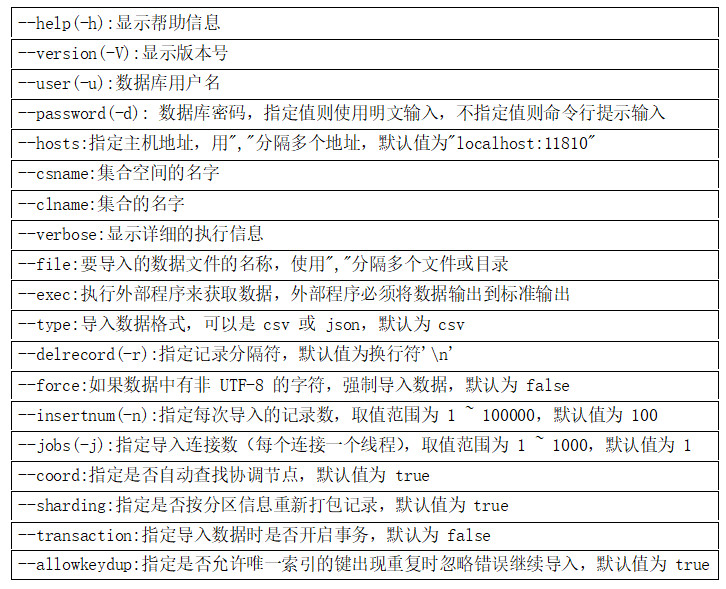 sdbimprt \--hosts 'localhost:11810' \--user 'sdbadmin' \--password 'sdbadmin' \--csname 'sbtest' \--clname 'sbtest1' \--insertnum 10000 \--jobs 20 \--type 'json' \--file '/tmp/sbtest.sbtest1.json'--coord false \--ignorenull true \--verbose true \--force false \--errorstop true \--sharding true \--transaction false \--allowkeydup true