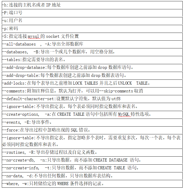 (1)备份所有库:mysqldump -h 192.168.3.6 -P 3306 -u root -p root123456 -A > /backup/all.sql(2)备份几个库:mysqldump --h 192.168.3.6 -P 3306 -u root -p root123456 -B 库名1 库名2 > /backup/database.sql(3)备份单个库某几个表(表名用空格隔开即可)Mysqldump -h 192.168.3.6 -P 3306 -u root -p root123456 库名 表名1 表名2> /backup/table.sql(4)mysqldump恢复mysql -h 192.168.3.6 -P 3306 -u root -p root123456 < /backup/all.sql;或者MySQL>source /backup/all.sql