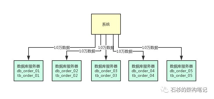比如可以把订单表一共拆分为1024张表,这样1亿数据量的话,分散到每个表里也就才10万量级的数据量,然后这上千张表分散在5台数据库里就可以了。