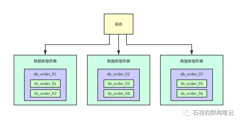 此时在5台服务器上都有一个订单库,名字可以类似为:db_order_01,db_order_02,等等。