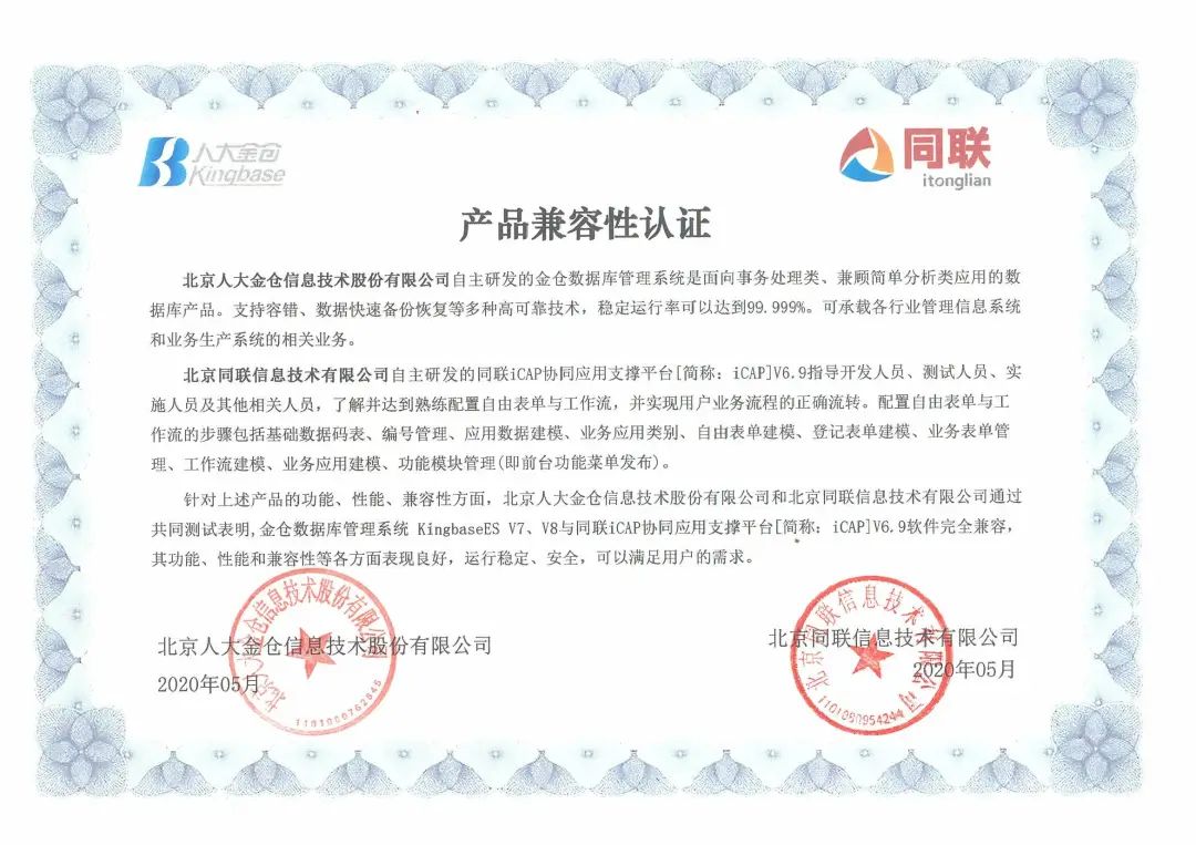 2020年5月,金仓数据库管理系统KingbaseES与同联iCAP协同应用支撑平台V6.9完成产品适配互认证,双方产品完全兼容,运行稳定、安全,可满足用户需求。