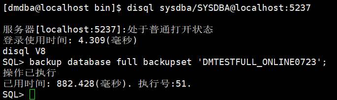 SQL> backup database full backupset 'DMTESTFULL_ONLINE0723';