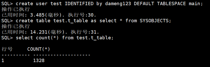 SQL> create user test IDENTIFIED by dameng123 DEFAULT TABLESPACE main;SQL> create table test.t_table as select * from SYSOBJECTS;
