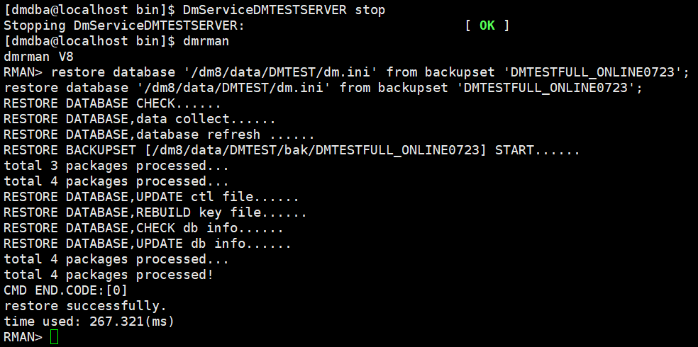RMAN> restore database '/dm8/data/DMTEST/dm.ini' from backupset 'DMTESTFULL_ONLINE0723';