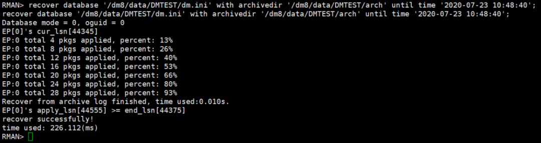 RMAN> recover database '/dm8/data/DMTEST/dm.ini' with archivedir '/dm8/data/DMTEST/arch' until time '2020-07-23 10:48:40';