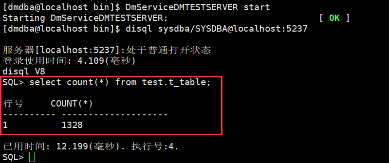 执行DmServiceDMTESTSERVER start启动数据库,连接数据库查询test用户下t_table表数据,可以看到t_test表已恢复。