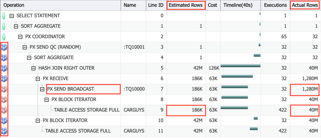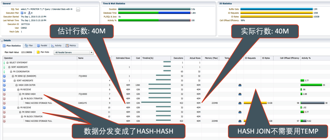 注意到,Line ID=9的那一行,Estimated Rows(估计行数)是186K,Actual Rows(实际行数)是40M,差了100倍还多。这条SQL执行的并行度是32,这样严重的偏差直接导致了Line ID=7的那一行,实际广播了40M*32=1280M数据,这些数据用来构造Hash Join中的Hash表,数据量太大在并行进程的内存空间里放不下了,就只能放到TEMP里面了。
