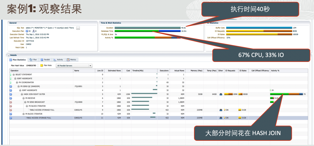 找到入手点之后,肯定首先要看看入手点那一步的执行的相关信息。这里我们可以看到,执行这一步的HASH JOIN,使用了64GB的TEMP。TEMP通常在硬盘上,latency是毫秒(10-³)级别。如果在内存里面执行的话,内存的latency是微秒(10-⁶)级别,所以大家可能都有一个印象,用TEMP就会慢。那么是不是想办法让SQL都在内存里跑,不用TEMP它就能快呢?