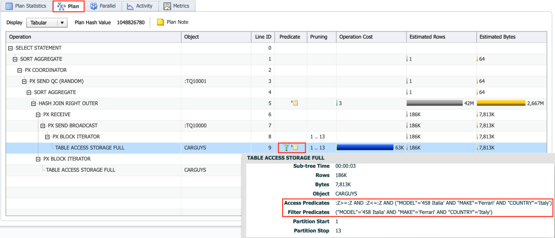 注意到SQL Monitor Report这个神器里面有好几个tab,点一下Plan那个tab,然后再点一下Line ID=9的那一行对应的Predicate列,就会出现上图右下角的小窗口,可以清楚的看到,访问Line ID=9的那一行的CARGUYS表的时候,使用的Predicate是,("MODEL"='458 Italia' AND "MAKE"='Ferrari' AND "COUNTRY"='Italy')