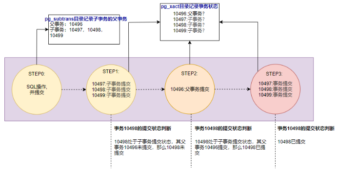 如果子事务在pg_xact目录中记录的状态为‘子事务提交’(TRANSACTION_STATUS_SUB_COMMITTED),那么需要去pg_subtrans目录下查找其父事务ID,根据父事务的提交状态判断子事务的提交状态;