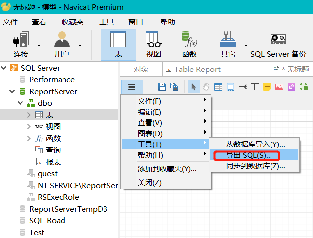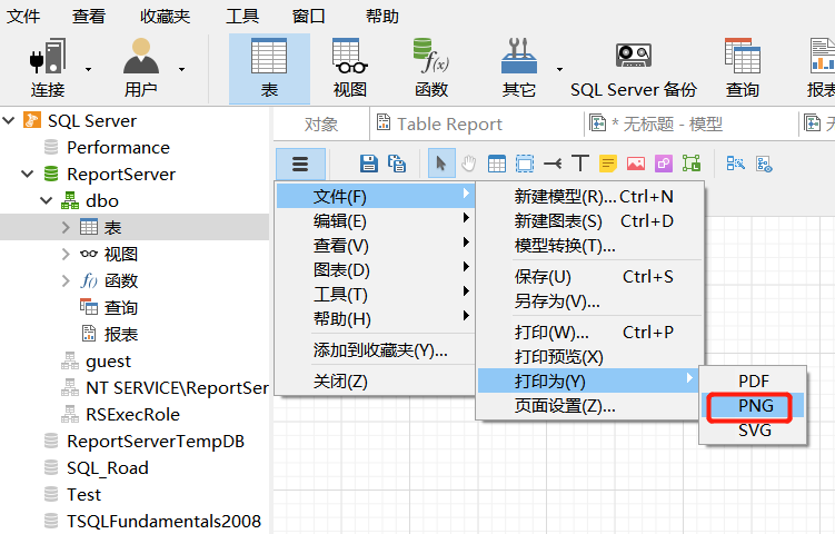 打印模式可以完美的生成所有表的数据表结构的。这里我们选择表数量较多的数据库ReportServer。右键dbo后,选择【打印模式...】,如下图: