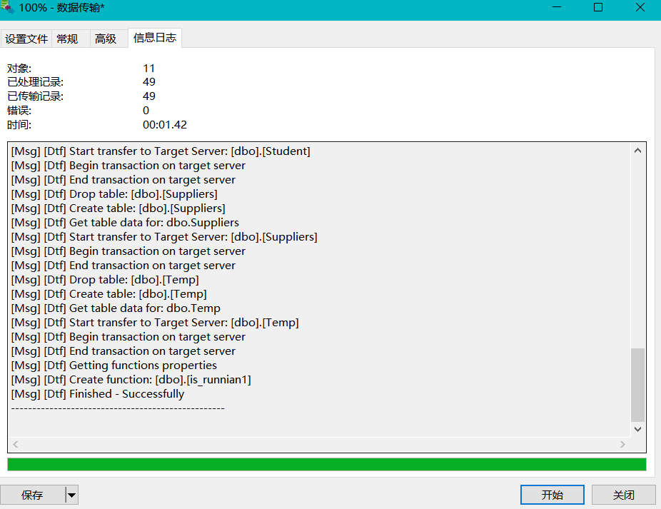 点击开始即可开始进行数据传输,传输效率还是很快的,即使你的数据量很大,也可以使用该方法进行数据传输,这里使用了不到2秒钟就将整个数据库对象迁移到新的数据库中了。