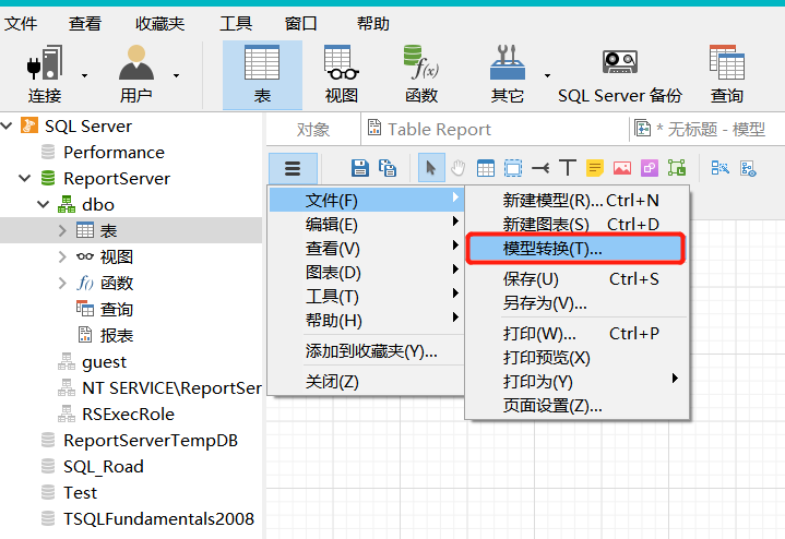 还支持模型转换,模型导出,说白了就是你可以将该模型转换成其他数据库的模型,从SQL Server转换成MySQL,Oracle,Postgresql都可以。点击左上角的三短横,选择【文件】——【模型转换】,如下图: