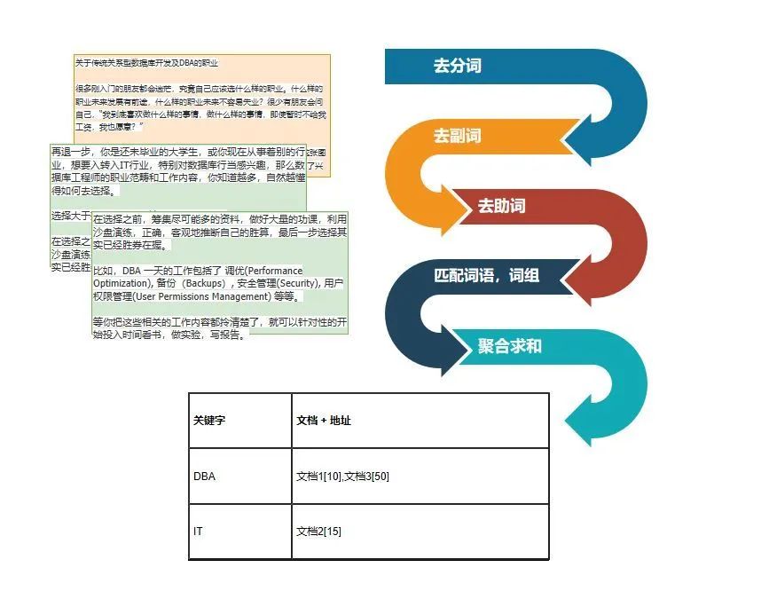 经过一系列处理后,最终会形成这样一个列表,记录着所有关键字,记住是所有文档中出现的关键字,对应的文档和在文档中出现的地址。比如 DBA, 在文档1和文档3中出现过,分别是在第10个位置和第50个位置。