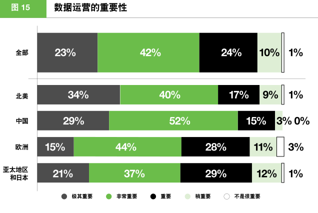 很显然,数据管理是全球性的话题,但是不同地区对于这一话题的关注程度和实施力度也不小的差异。《数据新视界》调查发现,中国企业尤其在乎数据的价值,比如上图中欧洲地区认为数据“不是很重要”的比例高达3%,但是中国区这个数字居然是零。