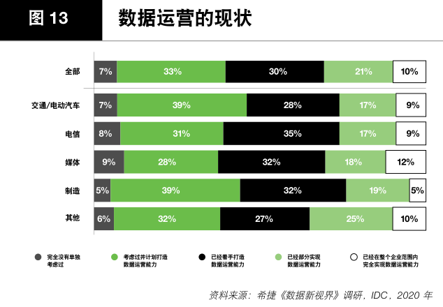 根据《数据新视界》提供的内容:只有10%的企业全面实施了数据运营,但大多数受访者表示,数据运营“非常”或者“极其”重要。这也暴露出企业管理者在数据问题上的“知行不一”,正如我们前面提到的,这其中有IT系统的历史遗留问题,也有对于新兴技术的应用不到位。