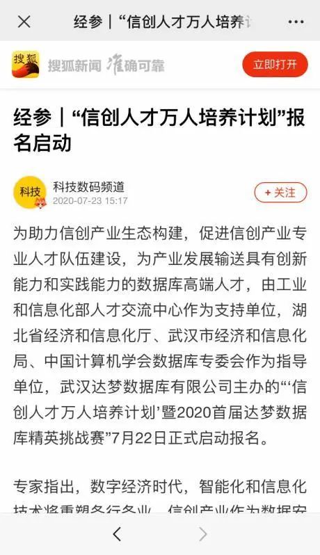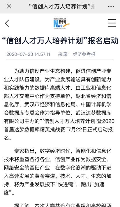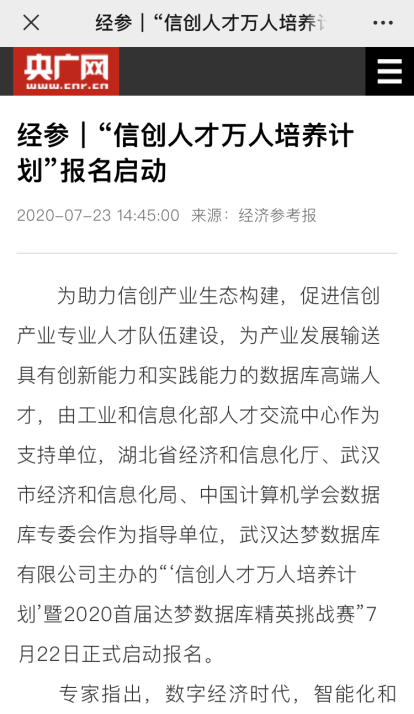 近日,达梦公司主办的“‘信创人才 万人培养计划’暨2020首届达梦数据库精英挑战赛”获多方关注,大赛报名通道一经开启,在短短的5天时间内,已收到并审核通过2000多位数据库精英的报名信息,更多报名信息目前正在紧锣密鼓地审核中。大赛启动新闻正式发布后,包括新华社、央广网、新浪网、搜狐网、经济参考报等多家主流新闻媒体,快科技、极客网等科技领域垂直媒体在内的30多家媒体争相报道。