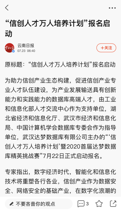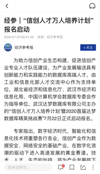 这充分反映了业内人士和各媒体平台对达梦数据库精英挑战赛的肯定,对信创产业的密切关注和对国产信息技术全面崛起的殷切期待。作为信创产业中的重要一环、数据库领域中的领军企业,达梦将始终秉持初心,以行动印证“产业报国”的初心和使命,以行动回应媒体和社会各界的关注!