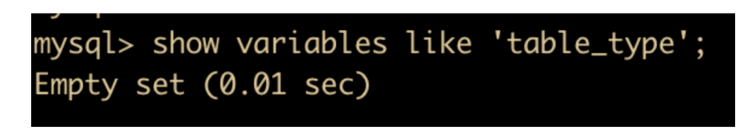 MyISAM InnoDB BDB MEMORY MERGE EXAMPLE NDB Cluster ARCHIVE CSV BLACKHOLE FEDERATED