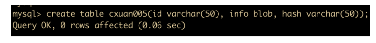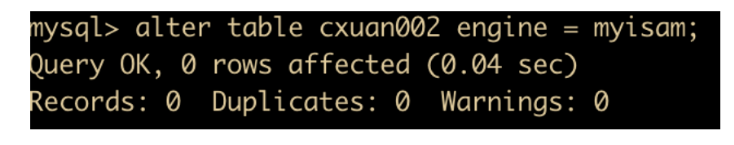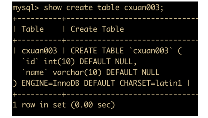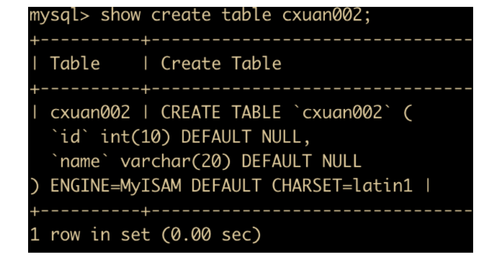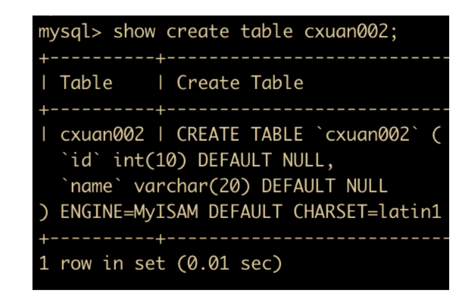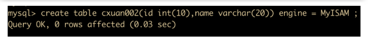 create table cxuan002(id int(10),name varchar(20)) engine = MyISAM;
