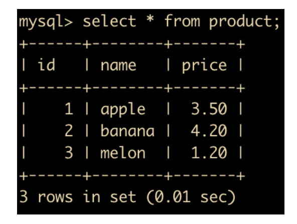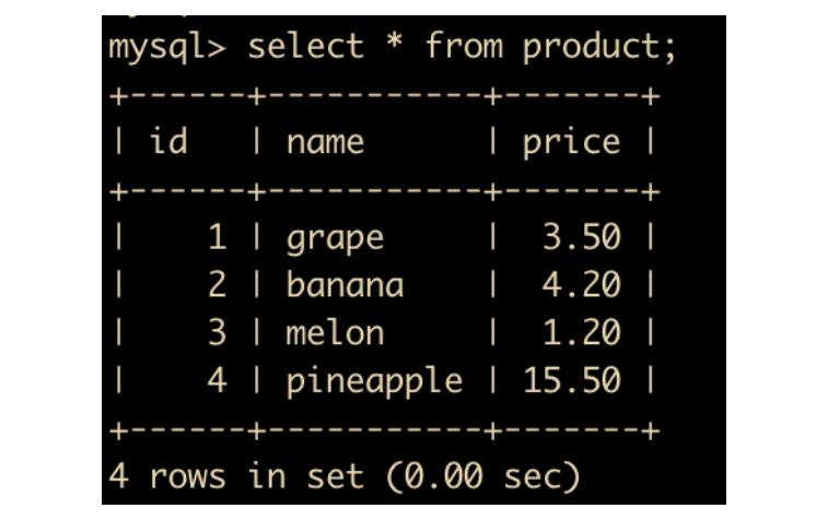 我们进行 select 查询,可以看到现在 product 表中有四条数据