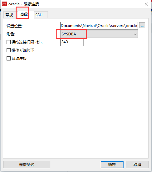 如果你是使用DBA角色登录的,还需要点开高级选项卡,将角色选为DBA