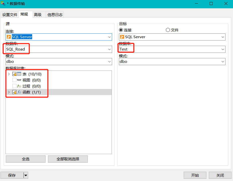 右键刚才创建好的Test数据库,在弹出的选项中选择【数据传输...】,在弹出的窗口中我们配置源数据库为【SQL_Road】,目标数据库配置为【Test】,这样就可以将SQL_Road中的对象传输到Test了,支持传输的对象包括:表,视图,函数和存储过程,具体如下图: