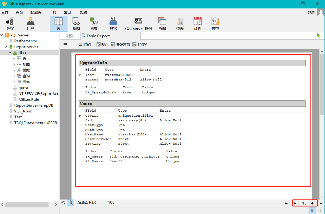 打印模式可以完美的生成所有表的数据表结构的。这里我们选择表数量较多的数据库ReportServer。右键dbo后,选择【打印模式...】,如下图: