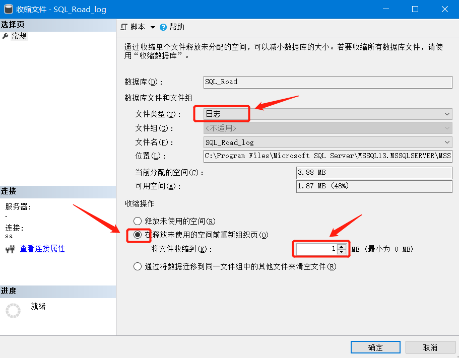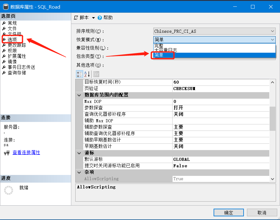 右键要清理的数据库名 - 属性,切换到选项,将恢复模式修改为简单,如下图1,然后点确定。