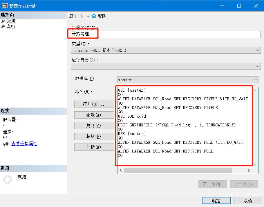 USE [master]GOALTER DATABASE 要清理的数据库名称 SET RECOVERY SIMPLE WITH NO_WAITGO--将数据库设置为简单模式ALTER DATABASE 要清理的数据库名称 SET RECOVERY SIMPLEGOUSE 要清理的数据库名称GO--将数据库的日志收缩为2MDBCC SHRINKFILE (N'要清理的数据库名称_log' , 2, TRUNCATEONLY)GOUSE [master]GOALTER DATABASE 要清理的数据库名称 SET RECOVERY FULL WITH NO_WAITGO--将数据库恢复为完整模式ALTER DATABASE 要清理的数据库名称 SET RECOVERY FULL GO