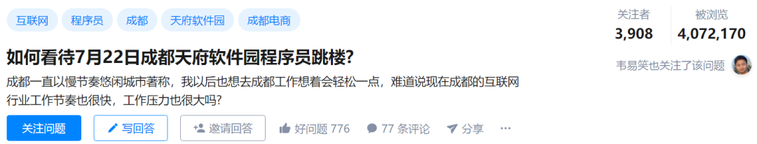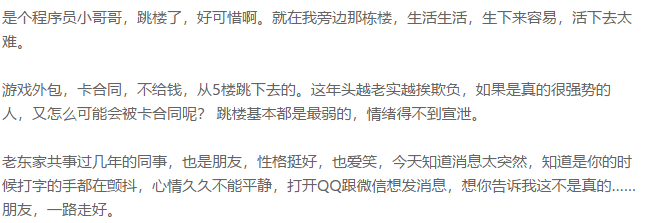 如今,互联网人的工作压力很大,加班加点是常有的事情,平时工作繁重,少有同亲朋好友相聚的时光,遇到的烦心事也较多,心理脆弱的人容易选择过激的行为。