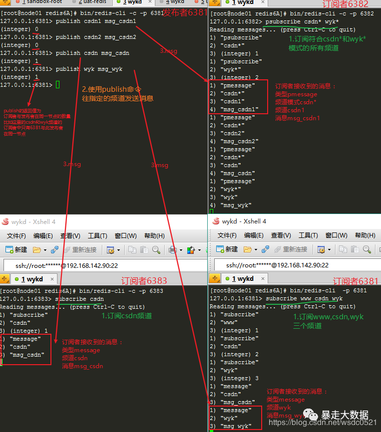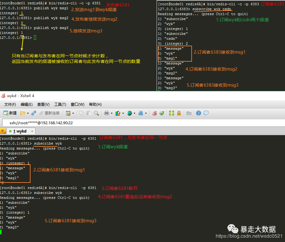 订阅者6381:与发布者在同一节点,订阅www,csdn,wyk三个频道;