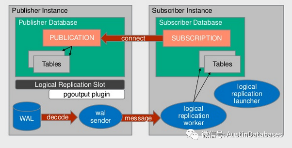 逻辑复制还是使用物理复制架构实现,从上图可见, 在复制槽的基础上添加了pgoutput plugin 将原有的wal 日志转换后发送, subscription 在接受这些信息,将信息填充到目的地. 为了避免数据被重复的在subscription 上重复操作,通过客户端记录接受的LSN号码,避免重复接受同样的数据,并操作.