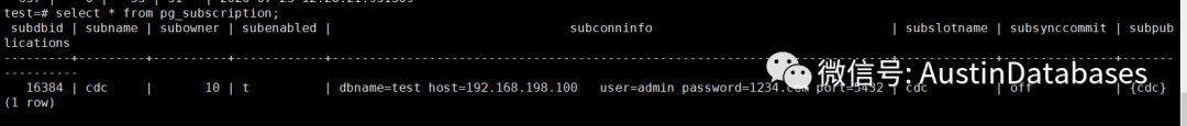 如果你当前有一个replication 的情况下, 查询主库,如果复制正常,则会查出你与subscription之间的情况, 如果数据不一致,造成复制停止的情况,则再次查询就不会有数据显示了. 所以这也是一个判断逻辑复制是否正常的一个方式方法.