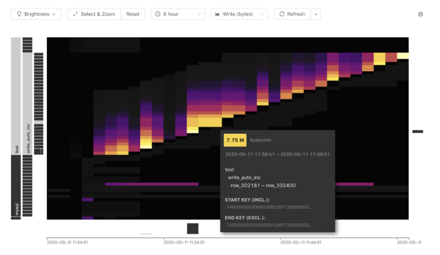 观察上图明亮的部分,可以看到有规律的斜线,可以清晰的看出是一个流量随着 Region 范围增长的热力图,这是一个典型自增主键造成的热点。鼠标指向其中一个色块,可以看到具体热点背后的库表信息。