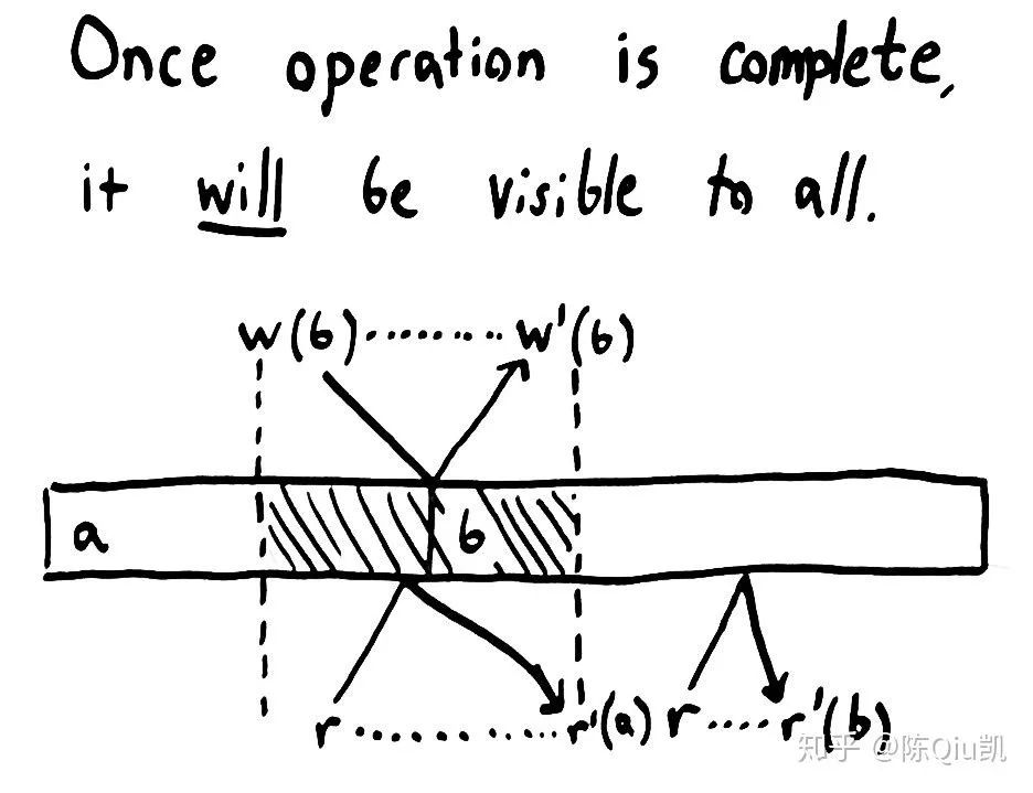 此外,线性一致性的时间界限保证了操作完成后,所有变更都对其他参与者可见。于是线性一致性禁止了过时的读。每次读都会读到某一介于调用时间