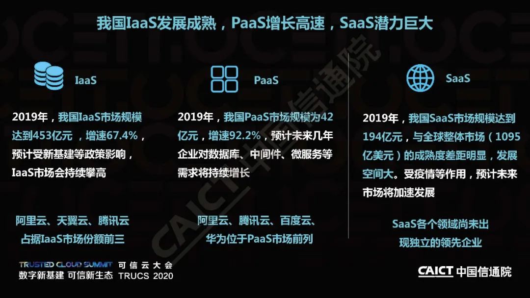 “疫情下,越来越多的企业接受SaaS的模式。”栗蔚表示,从业务上看,我国IaaS发展成熟,PaaS增长高速,SaaS潜力巨大。2019年,我国SaaS市场规模达到194亿元,与全球整体市场(1095亿美元)的成熟度差距明显,但是发展空间却十分巨大。尤其是受疫情的推动,预计未来市场将加速发展。