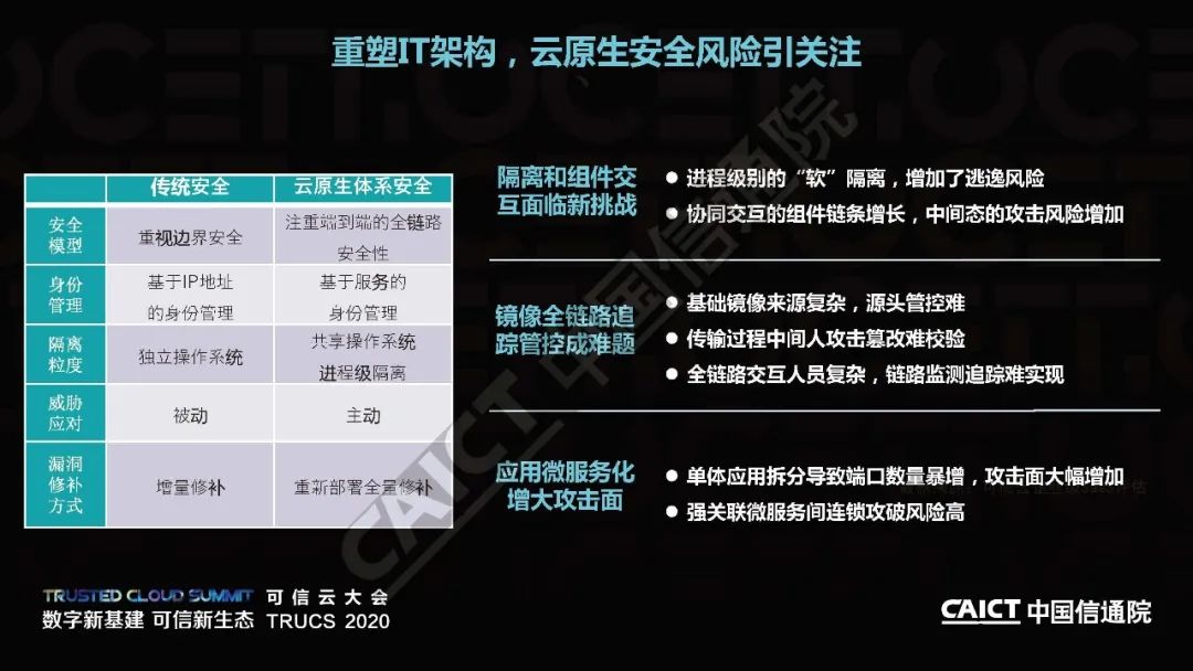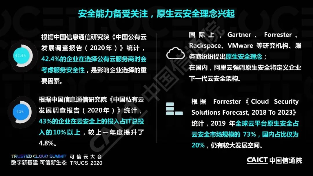 “近年来,一个新的理念诞生,即原生云安全。”栗蔚表示,中国信通院发布的《中国公有云发展调查报告(2020年)》显示,42.4%的企业在选择公有云服务商时会考虑服务安全性,安全是影响企业选择的重要因素。而随着云原生快速兴起,原生云安全也成为关注焦点。