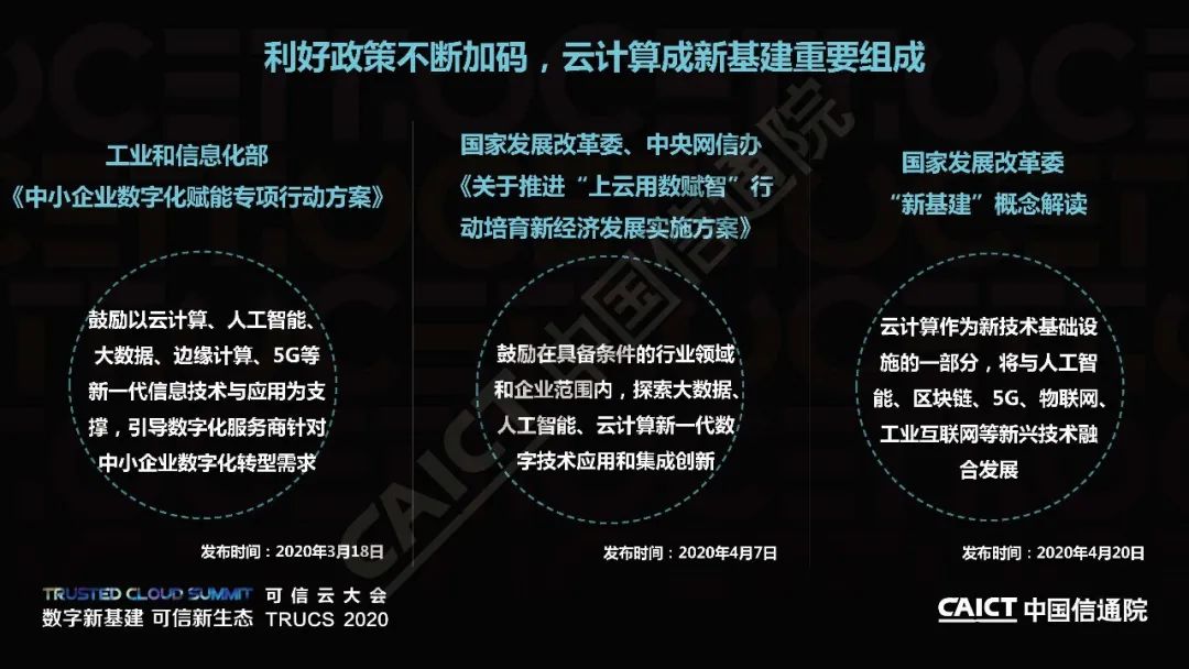 “随着利好政策不断加码,云计算已经成为新基建的重要组成部分。”栗蔚表示,无论是工业和信息化部发布的《中小企业数字化赋能专项行动方案》,国家发展改革委、中央网信办发布的《关于推进“上云用数赋智”行动培育新经济发展实施方案》,还是国家发展改革委对新基建概念的解读,都表明——云计算已经成为新基建的重要组成部分。