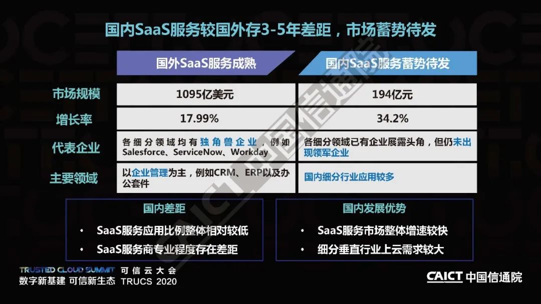 “目前,国内SaaS服务较国外相比存在3-5年差距,但是正是因为有差距,同时加上疫情的‘驱动’,国内市场蓄势待发。”栗蔚介绍,从这几年企业上云的情况也能够发现一些“端倪”:尽管目前国内没有SaaS独角兽企业,但是企业上云中,很多行业客户因为对于基础IT不是特别熟悉,因而更多会选择和行业相关的SaaS服务,国内细分行业SaaS市场需求旺盛。